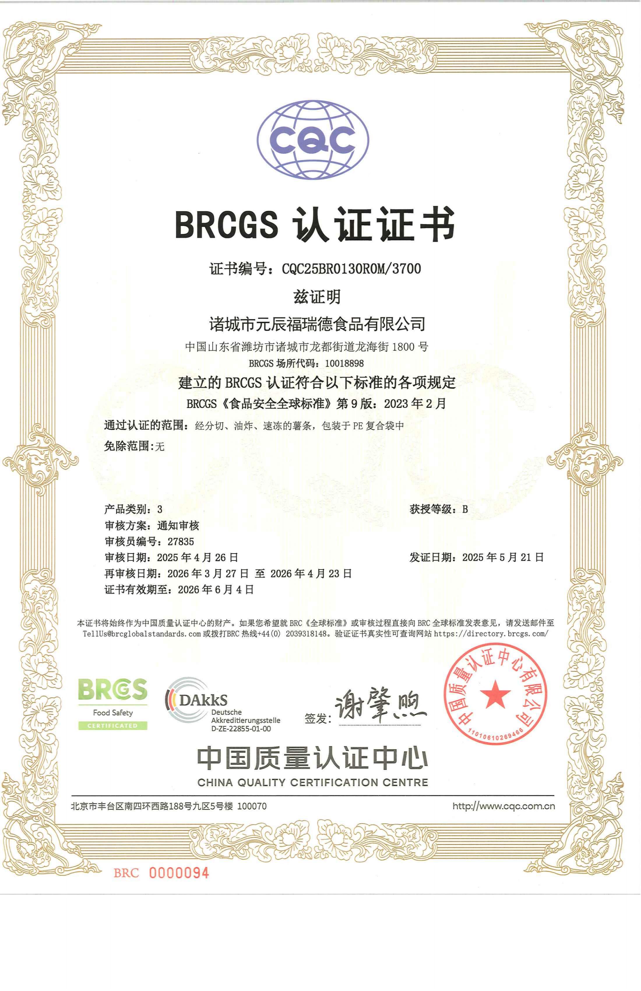 Fritto十分注重产品质量和食品安全,因此,我们通过了BRC认证。 BRC认证是由英国零售商协会制定的国际性标准,是主要针对食品、包装及消费品行业的安全与质量管理体系。该认证涵盖食品安全、产品质量、生产流程和供应链合规性等核心要求,旨在确保企业符合全球零售商的严苛标准。